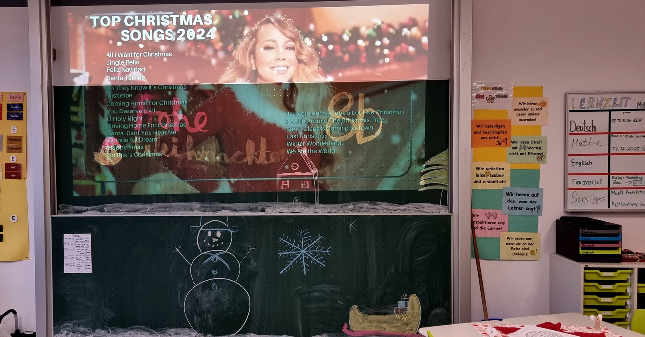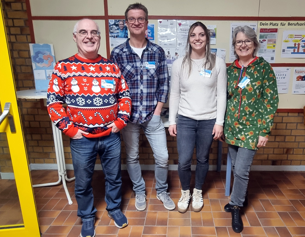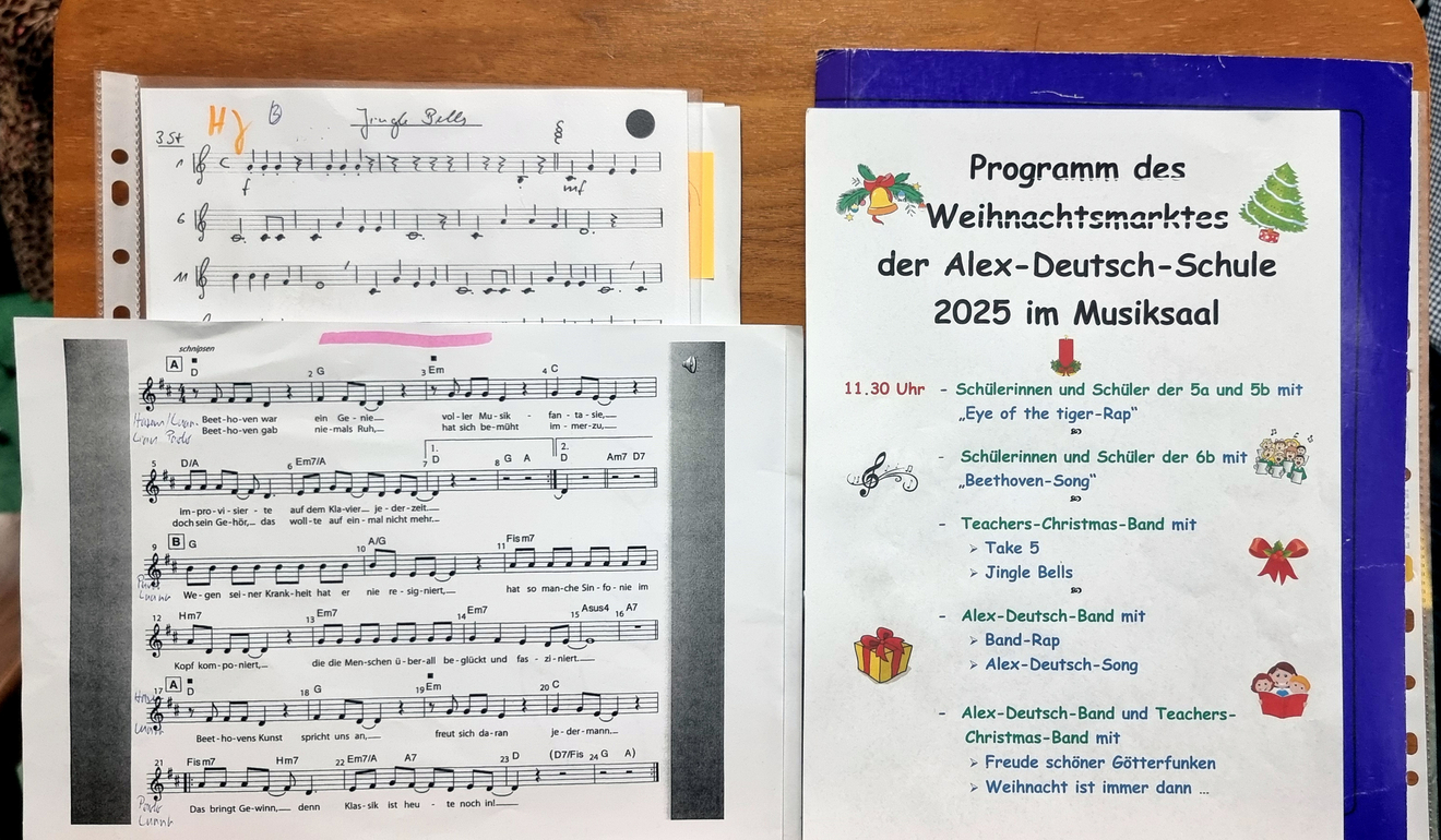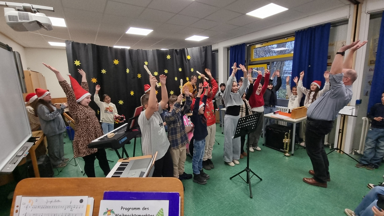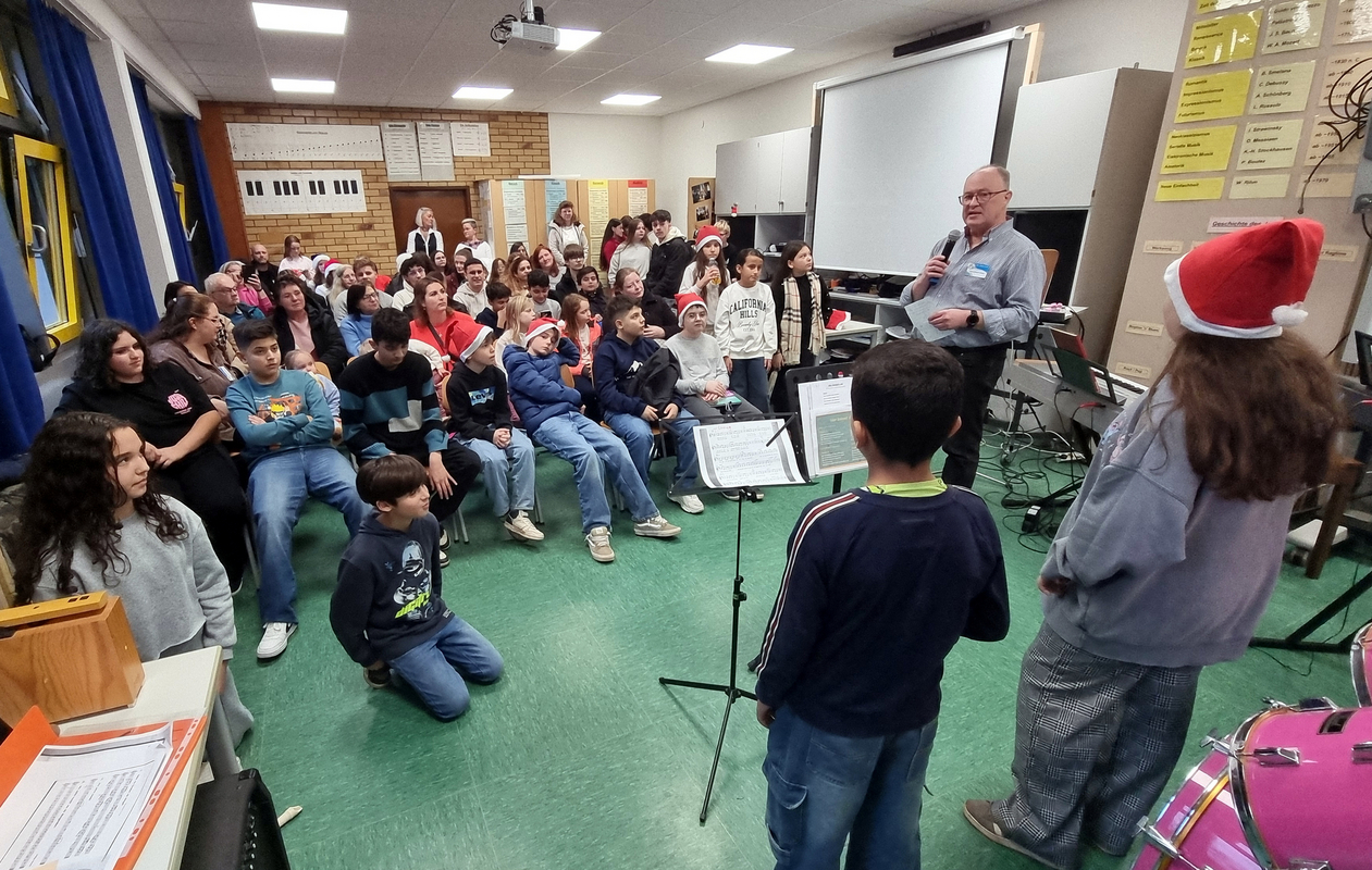 Das sprichwörtliche „Tüpfelchen auf dem i“ bildeten einmal mehr die musikalischen Beiträge verschiedener Schülergruppen und der aus vier Lehrkräften bestehenden „Teachers-Christmas-Band“ unter der Gesamtleitung von Musiklehrer und Moderator Hans-Jürgen Geiger. Das Repertoire reichte vom „Eye of the Tiger-Rap“ über den Beethoven-Song, das selbst vertonte Alex-Deutsch-Lied oder die Sinfonie „Freude schöner Götterfunken“ bis hin zum Weihnachtsklassiker „Jingle Bells“. Gut zweimal so groß hätte der Musiksaal sein dürfen, um allen interessierten Besuchern Platz bieten zu können.