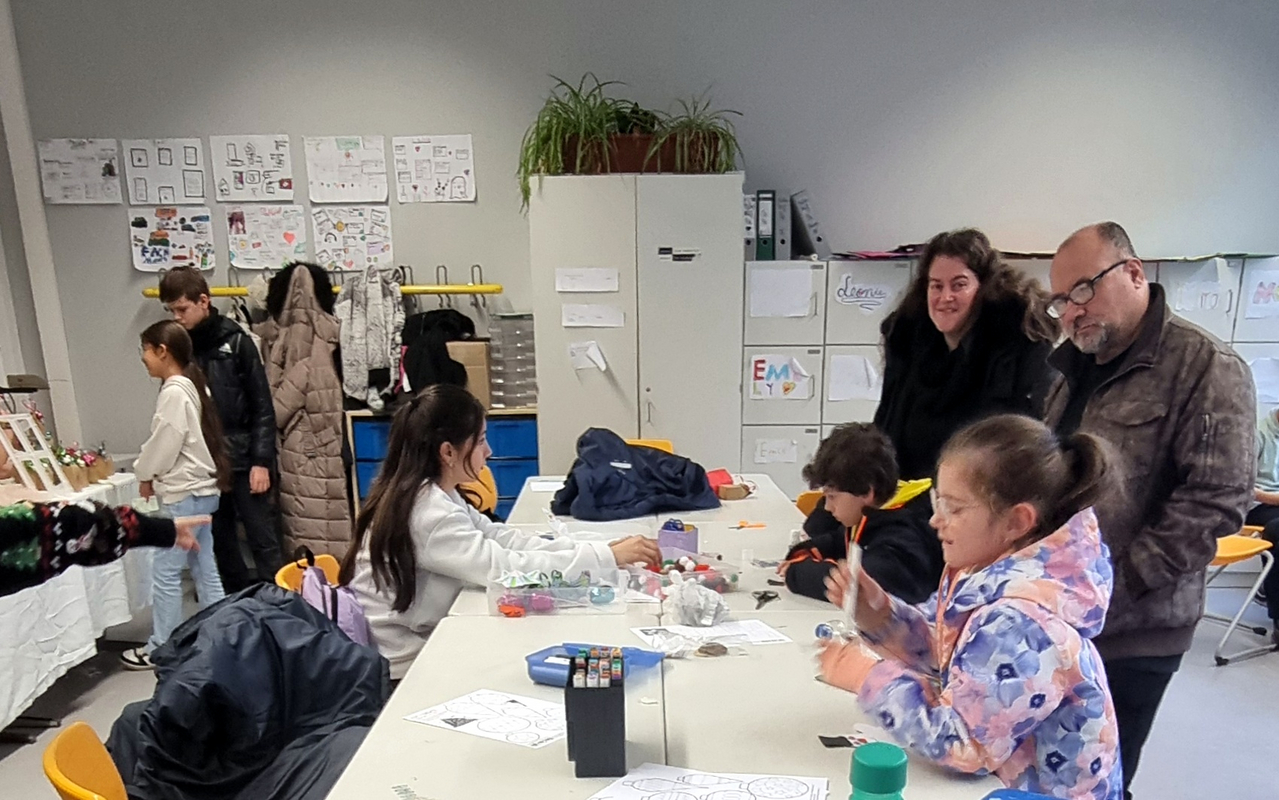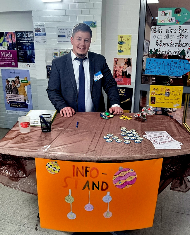 Inmitten dieses festlichen Fluidums hatte es die Schulleitung unter Ulrike Rothermel und ihrem Stellvertreter Olaf Schley wahrlich nicht leicht, einer weiteren Zielstellung an diesem Tag der offenen Schultür gerecht zu werden. Gemeint ist das Bemühen, alle interessierten Viertklässler aus benachbarten Grundschulen und ihre Eltern an einem Infostand gleich neben dem Sekretariat von den zahlreichen unterrichtlichen und organisatorischen Vorzügen einer Ganztags-Gemeinschaftsschule zu überzeugen, eventuelle Vorurteile zu zerstreuen und auf Fragen aller Art Antworten und Auskünfte zu erteilen. Unterstützung erfuhr die Schulleitung dabei auch von Schulelternsprecher Christian Jochum, der außerdem die Mitverantwortung über Kasse und Bon-Verkauf übernommen hatte. „Die Eltern haben durch ihre aktive Mitarbeit und Kuchenspenden auch diesmal einen großen Anteil zum Gelingen der weihnachtlichen Traditionsveranstaltung beigetragen, die seit 2018 in dieser erfolgreichen Kombination stattfindet“, betonte die Schulleiterin. Den familiären Charakter der kleinen Schule im Grünen sieht Ulrike Rothermel zudem durch den Besuch vieler ehemaliger Schülerinnen und Schüler bestätigt. „Dass ehemalige Schüler ihre eigenen Kinder bei uns anmelden wollen, ist Bestätigung für die gute Arbeit, die hier geleistet wird“, ergänzte sie stolz.