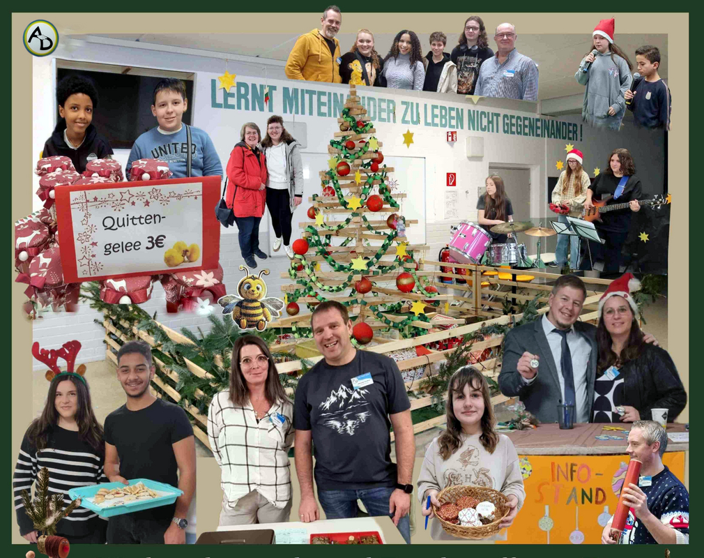 Kunstvoll gestaltete Hinweisschilder, der betörende Duft nach Selbstgebackenem, weihnachtliche Klänge aus vielen Sälen und vor allem ein prächtig geschmückter Tannenbaum im Foyer nebst einem zauberhaften Weihnachtsarrangement an zentraler Stelle der Schule ließen keinen Zweifel daran aufkommen, dass Weihnachten naht, das Fest der Liebe, des Friedens und der Freude.