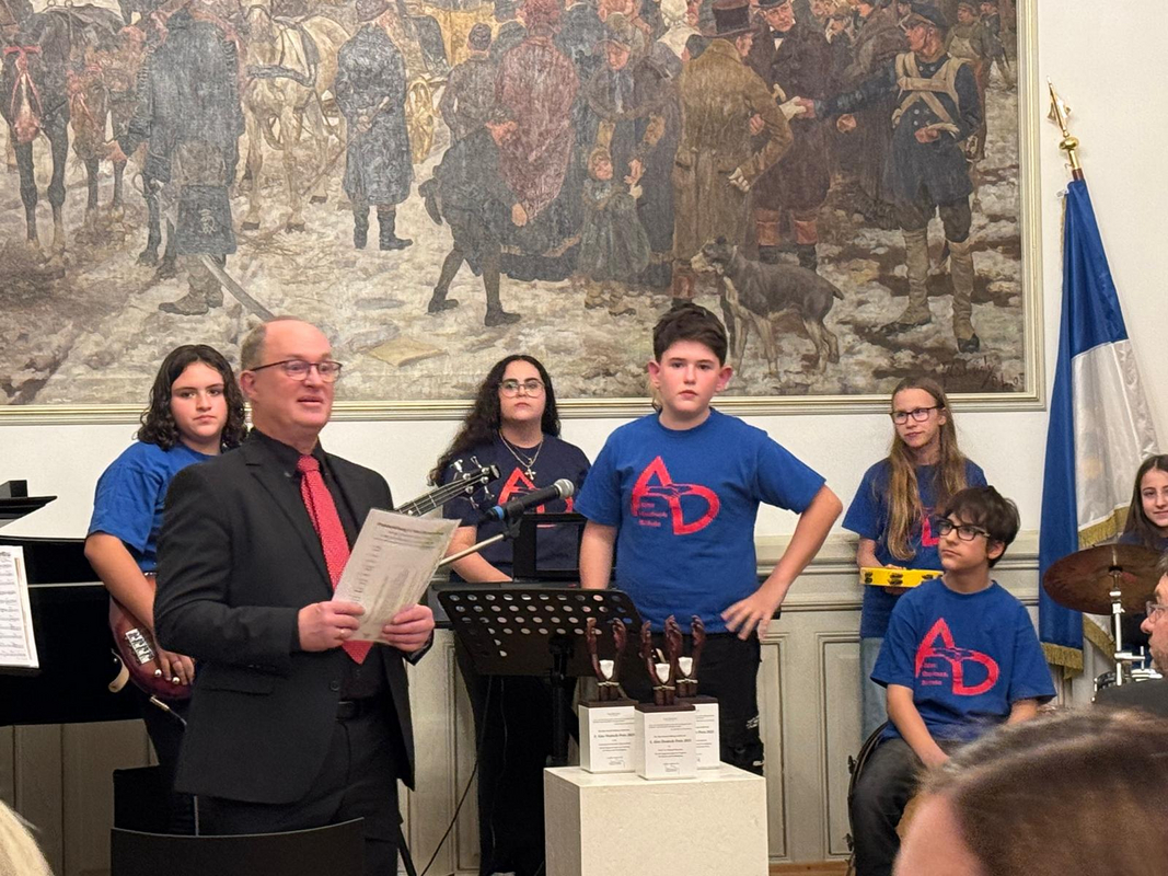 Ein Novum bei der vierten und damit jüngsten Ausgabe der Verleihung am 3. November im Historischen Sitzungssaal des Landratsamtes in Ottweiler bot nach Worten von Musik-Fachleiter Hans-Jürgen Geiger die achtköpfige Schülerband, die sich diesmal ausnahmslos aus Mädchen und Jungen einer einzigen Klasse, nämlich der Klasse 7b, rekrutierte. An der Spitze gefiel Sänger und Frontmann Michael Wakula und auch im Weiteren offenbarten Lenja Kaiser (Percussion), Conner Kühner (Drums), Emely Rau (Klavier), Elias Reichert (Keyboard), Emilia Rocca (E-Bass), Cloey Roos (Drums) und Laura Sartori (Keyboard) beachtliche musikalische Qualitäten.